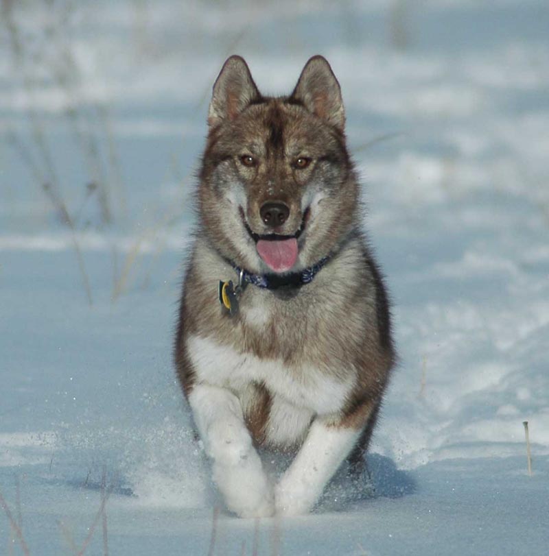 The answer to the color question is a question itself! In the book, The International Siberian Husky Club Inc. Presents The Siberian Husky, Ginny Emrich Rice states in the chapter on Color Genetics that these dogs do not technically qualify as agouti. However, most folks do consider them agouti. Some of them are registered as agouti. Others are not. The agouti color description specifically says that the guard hairs are banded, with “black at the root and the tip and yellow in the center band”. These dogs’ guard hairs are black thru the tip, with a bit of beige at the root. Their undercoat is tan (or cream), and they have very little white on their stomachs and legs. I believe that they come closest to the description of “wolf grey” (and they do indeed resemble a wolf!). According to the SHCA Coat Color Identification Guidelines, wolf grey is a sub-category under grey/white, so most of these dogs that are being shown are registered as grey/white. However, my concern (which is shared by the other owners of these dogs), is that in future generations when folks do pedigree research, the pedigree will give no indication of the unusual color that perhaps is showing up again in their litters. I do wish the SHCA would re-examine their color descriptions and come up with something that is more descriptive. I have consulted with numerous long-time breeders, some of which are very expert in color descriptions, asking their opinions on the color of these dogs. I have gotten responses ranging from “grey/white”, to “agouti”, to “I have NO IDEA - there is no color name to describe them!” (this latter response echoes my own, and came from Alice Watt who maintains a website devoted to the colors of the Siberian Husky! (LINK).
